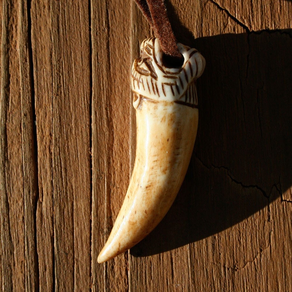 [At his throat is a leather thong one that he tugs out of his shirt. In the palm of his hand lies a carved tooth as long as his palm]